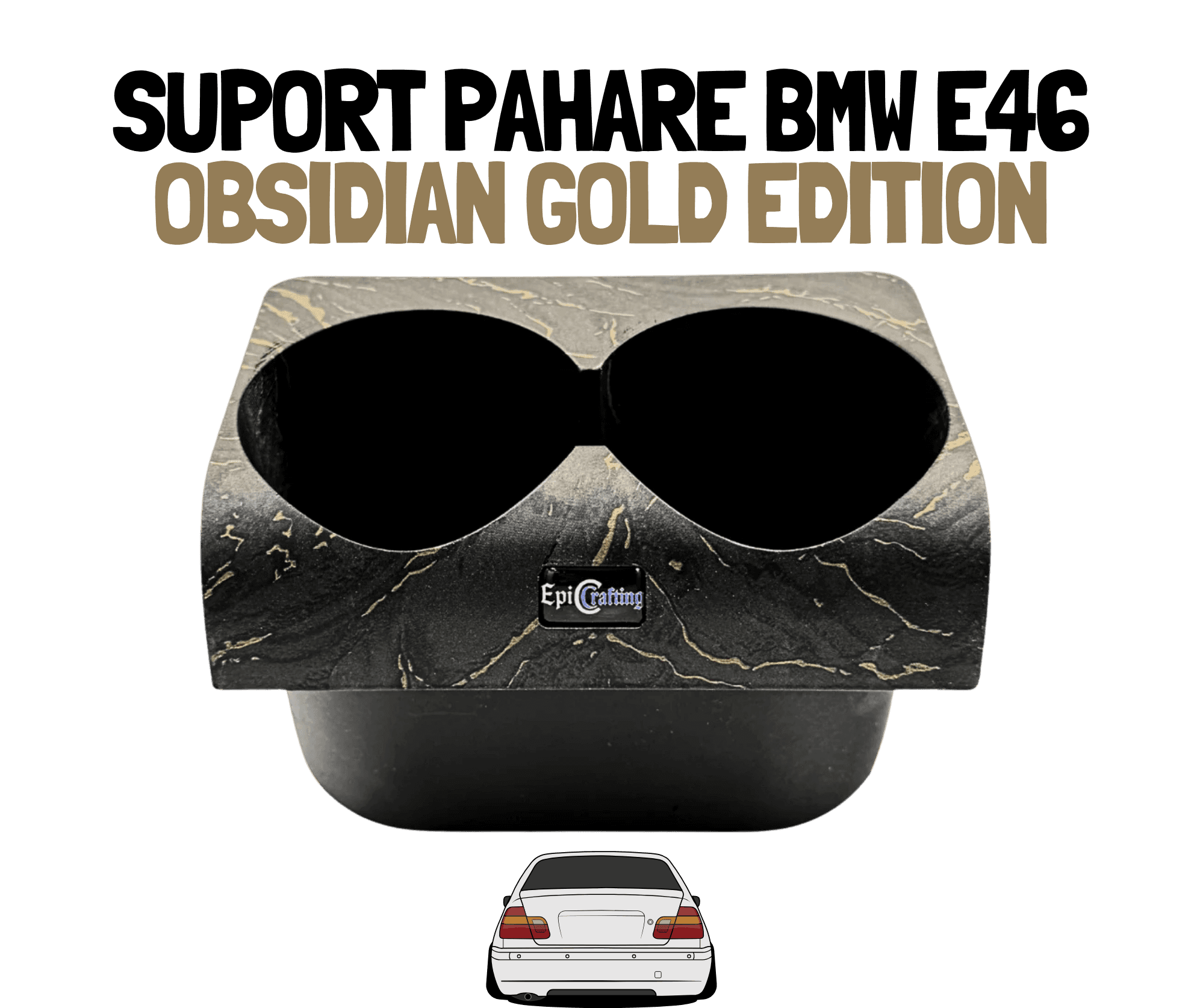 Suport de pahare dedicat pentru BMW E46 OBSIDIAN GOLD EDITION, creat special de Epic Crafting România pentru o integrare perfectă în interiorul original, fără să afecteze spațiul din consola centrală sau maneta schimbătorului de viteze.